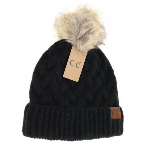 Chunky Braided Cable Knit Fur Pom C.C Beanie HAT7384