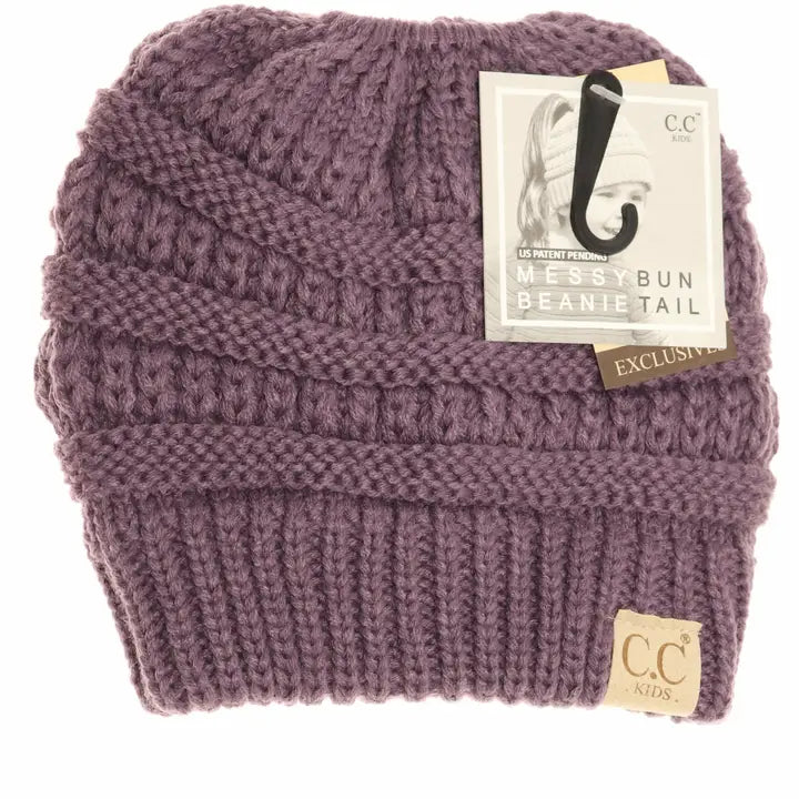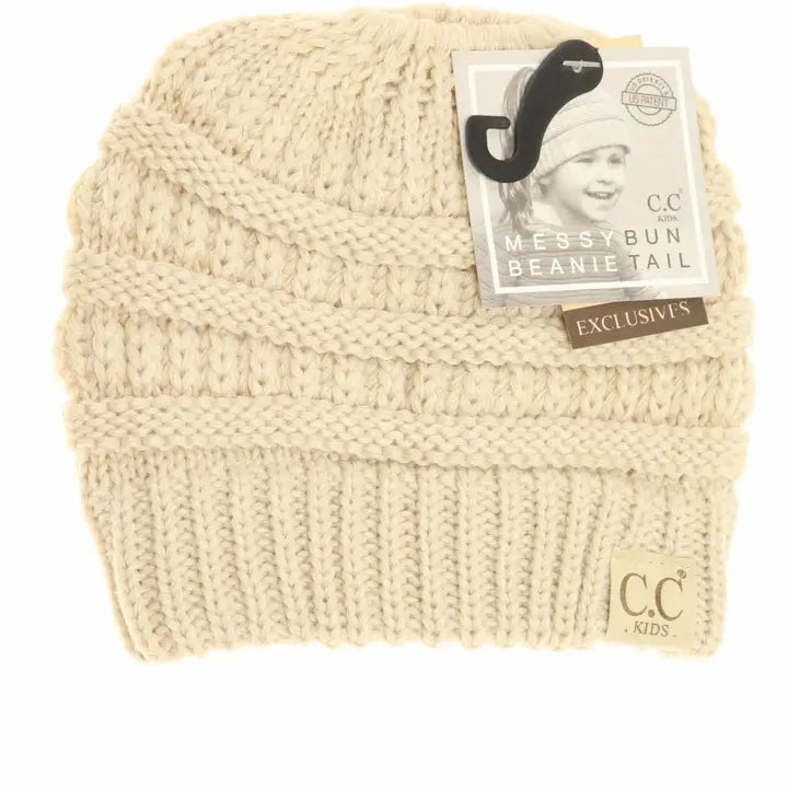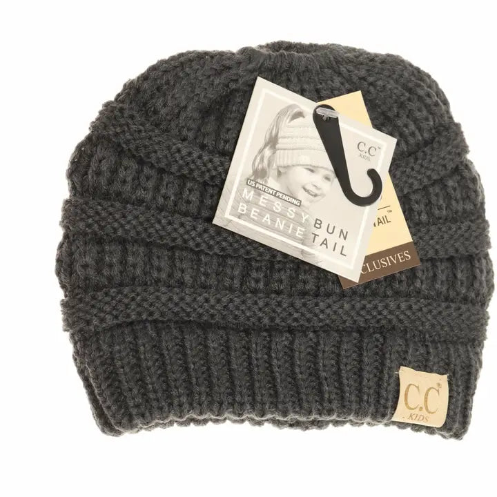 The much anticipated arrival of a "messy bun" CC beanie is here for kids! This CC beanie tail beanie allows your little one to wear her favorite head gear on a cold day, but pull her hair up!  It features an elastic opening in the middle to keep the beanie in place without slipping and is great for kids at play!  Get yours while supplies last at this INTRODUCTORY price!